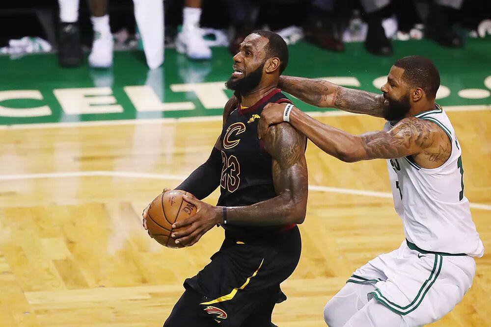 勒布朗的神奇还在继续:东部决赛,他带领骑士对战波士顿凯尔特人——之前东部半决赛,凯尔特人轻取了才华横溢的费城76人。欧文受伤无法出战季后赛,但2017年探花杰森·塔图姆和2016年探花杰伦·布朗,双杰探花初次联手,加上勒布朗的老熟人阿尔·霍福德坐镇内线。凯尔特人很快2比0领先了骑士:即便勒布朗第二场得到42分10篮板12助攻也无济于事。前两场比赛中,勒布朗还是在用对猛龙的持球指挥官思路打球,内线要位不够深,自己参与掩护也不够多。