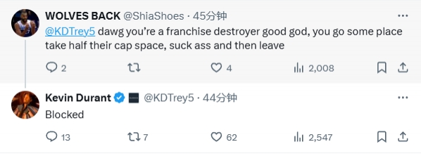 网友喷KD是球队毁灭者 吃一半空间打的跟屎一样就跑🤬KD:拉黑 频道:nba 日期:2025-07-17 浏览:174 07月04日讯 今日火箭前锋凯文-杜兰特在社交媒体上回复了网友评论:网友1:"兄弟,你TM简直是球队毁灭者!去一支队就吃掉人家一半的空间,打得跟屎一样然后拍拍屁股走人。”杜兰特:“拉黑了。” 上一篇:九年半赚3亿欧,队报:哈兰德周薪将达50万镑 相当于月薪257万欧 下一篇:Kaiyun Sports-邮报:加纳乔驾驶未缴税车辆前往训练场,因此他可能会面临罚款 相关文章 科利尔赛季180俱乐部&WNBA历史第二人 杜兰特转发 乘风破浪的下注之旅:在manbetx万博体验极致体育博彩 拉亚轻松“点”破14年魔咒!炼狱120分钟造更强枪手 中甲半场:安以恩破门,辽宁铁人1-0青岛红狮